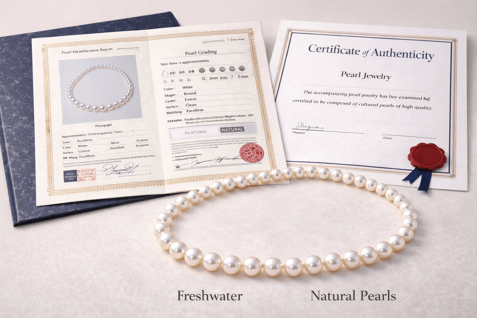 Däremot ger PearlsOnly certifikat för allt köpt. Detaljerade specifikationer inkluderade helt. Grad, lyster, yta, pärlemorsskikt – allt dokumenterat. PSL specifikt för Hanadama-pärlor. Omfattande dokumentation stödjer investeringsvärdet och eventuell framtida återförsäljning.