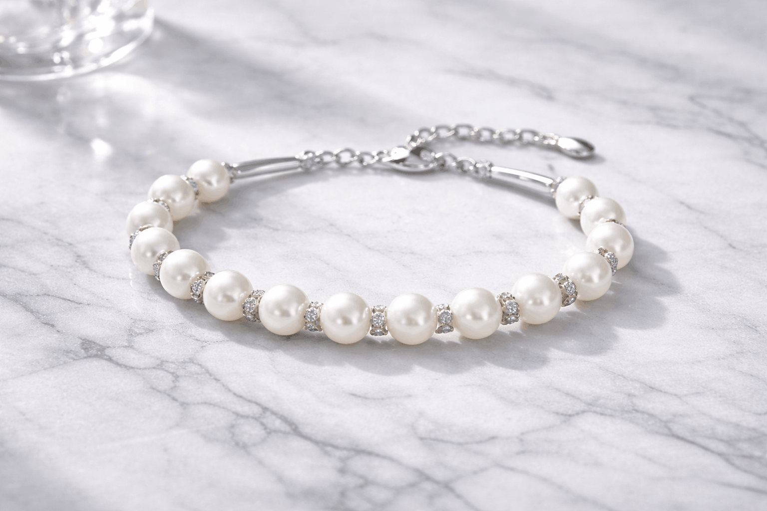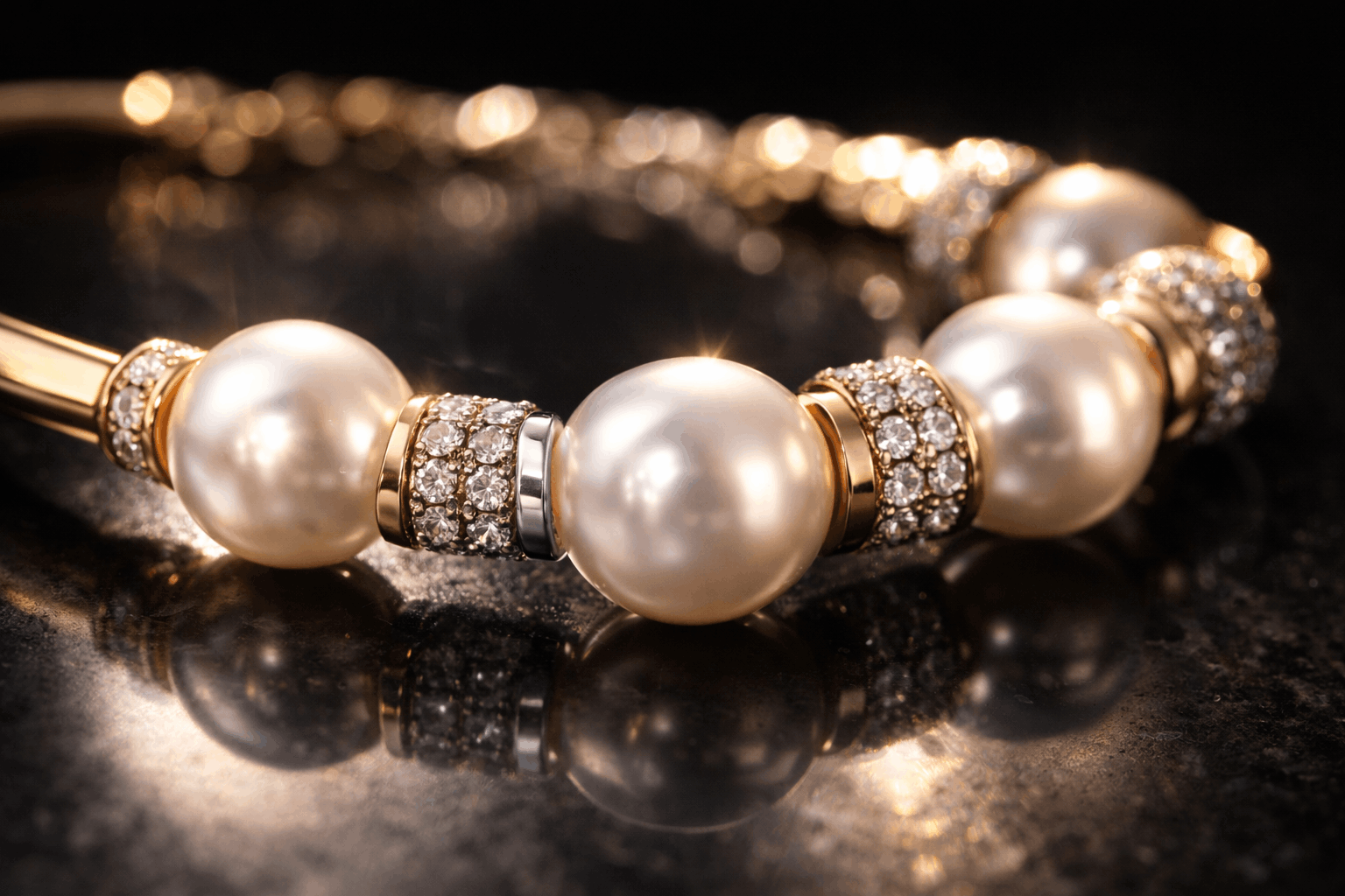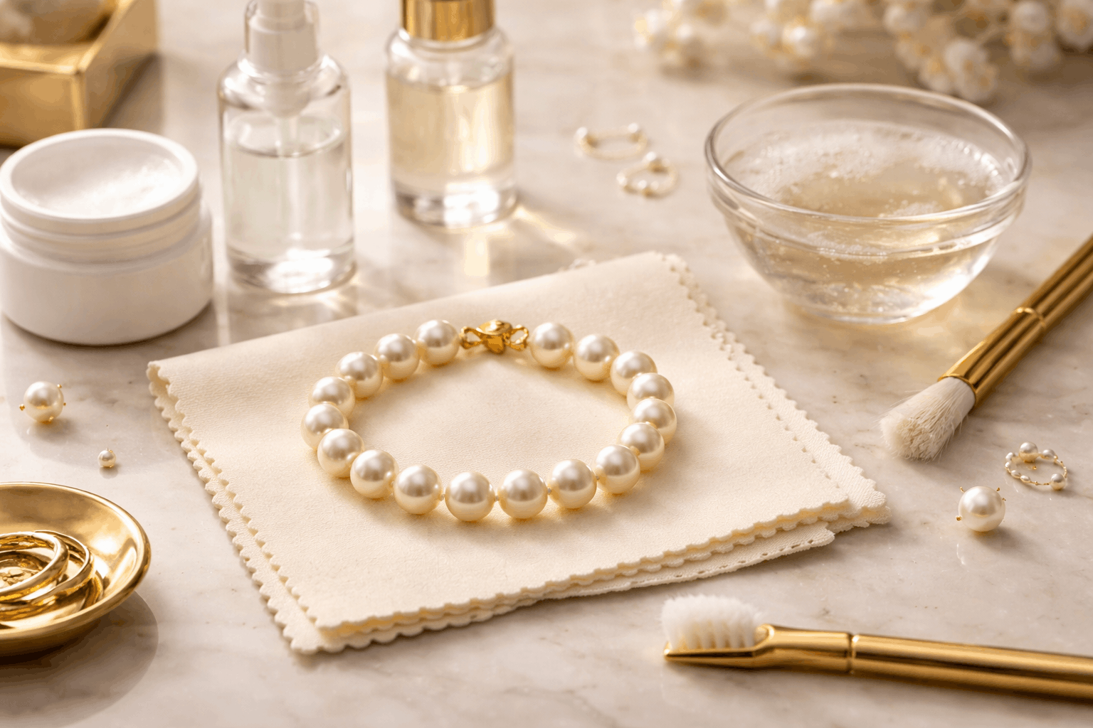Guld och pärlor behöver lite olika vård, så du måste balansera båda. Pärlor är känsliga och porösa – de absorberar kemikalier lätt. Sätt alltid på armbandet sist, efter att ha applicerat lotioner, parfym och hårspray. Ta av det innan du tvättar händer eller diskar. Kemikalier i tvål skadar pärlorna med tiden.