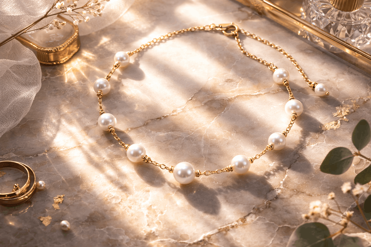 Guld är tåligt men pärlor är ömtåliga som fan. Den här kombinationen kräver vård som hanterar båda materialen korrekt. Spraya aldrig parfym eller hårspray medan du bär ditt guld halsband med pärlor. De kemikalierna skadar pärlornas pärlemor permanent och irreversibelt över tid. Sätt på smyckena sist efter att alla skönhetsprodukter är applicerade och helt torra.