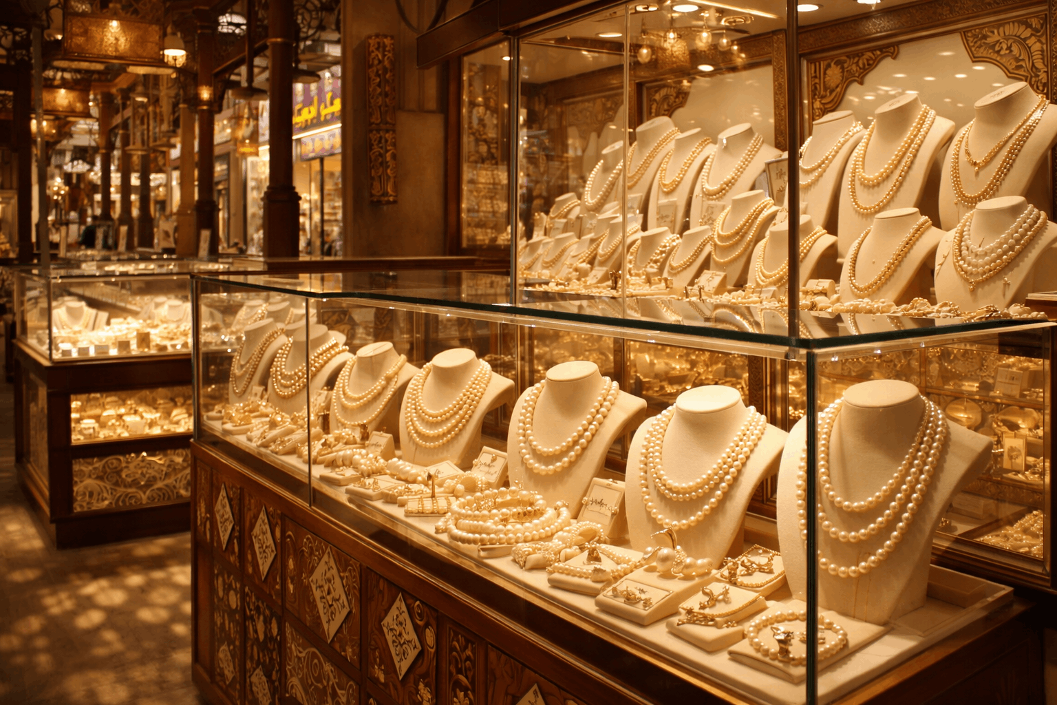 Dubais Gold Souk i Deira är fortfarande den mest kända destinationen för att handla pärlsmycken. Hundratals butiker packade i smala täckta gränder. Stämningen är helt elektrisk. Handlare ropar. Guld glittrar överallt. Pärlor visas i fantastiska skyltfönster som fångar ljuset vackert.